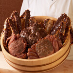 メニューはコースのみ。「活けたらば蟹コース」時価55,000円〜や「活け毛蟹と気仙沼フカヒレコース」55,000円などが通年で楽しめます。さらに、11〜3月の期間は松葉蟹が登場するなど、季節限定のコース(65,000円〜)も用意されています。