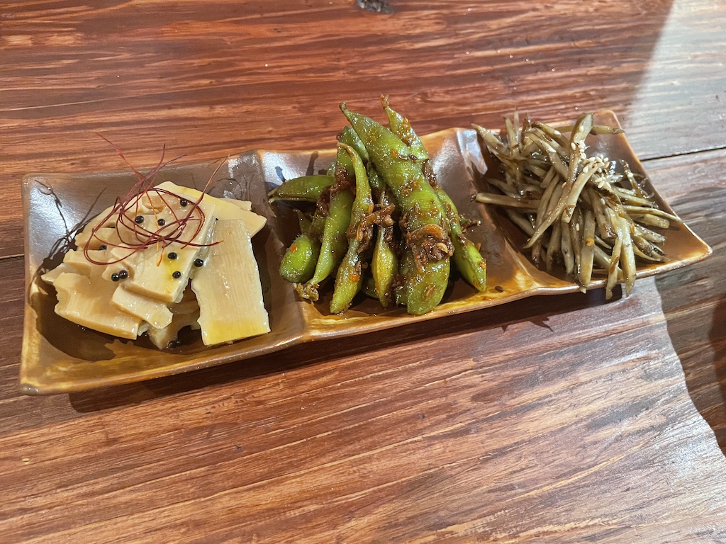 たけのこマスタードオイル煮、枝豆の花椒マサラ 甘唐辛子のあみえびオイル、ごぼうのクミンきんぴらという組み合わせ。どれもシンプルにひとつのスパイスの個性を味わえる楽しいものでお酒もすすみます。