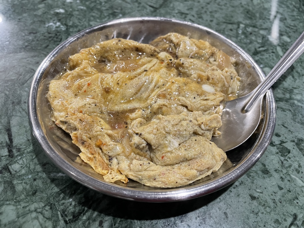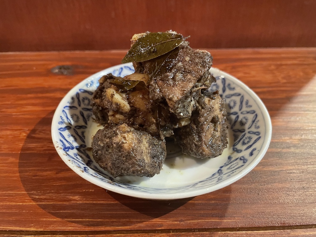 一人客用にハーフサイズで注文可能なメニューが多いのもうれしいポイント。「スリランカのカツオじゃがいも黒胡椒煮」400円(ハーフ)はスリランカ料理のアンブルティヤル(魚をゴラカなどのスパイスで煮込んだもの)にじゃがいもを合わせ、アンブルティヤルならではの酸っぱ辛さにじゃがいもの優しさが寄り添う良いおつまみです。