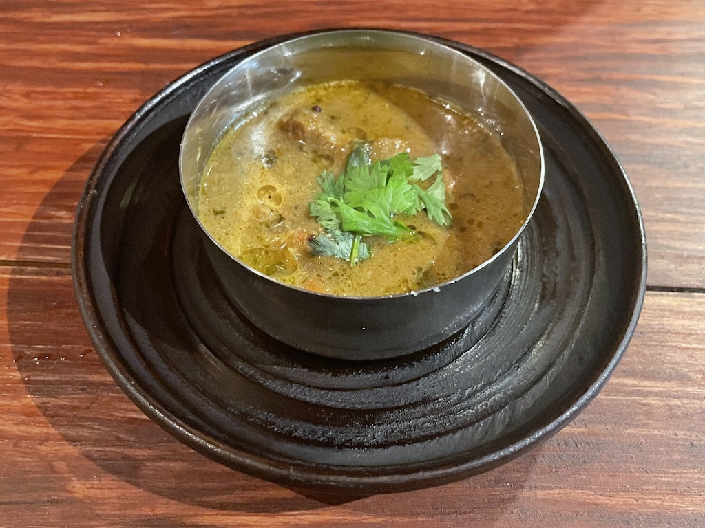 茶碗カレーは同店の定番「シャバいチキンカレー」をご飯にお茶漬け感覚でかけたもの。シンプルなチキンカレーなのですが奥深いうまみを感じ、何かだしを使っているのか聞いてみると「だしやうま味調味料は使用していないです。ただこちらは長年作り続けているのですが、いつの間にか謎の深みが出てきました(笑)」とのこと。洗練されたメニューということでしょう。コリアンダーポークもわかりやすく食べやすいテイストに花椒の程よい刺激が良いです。