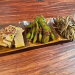 まずはマーガオ焼酎「CHILL GREEN」600円で乾杯。おつまみに「前菜3種」700円。