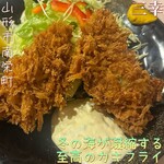 大ぶりな牡蠣を2個抱き合わせたフライは、皿をグルンと囲んでそびえ立ち、ストーンヘンジかと思った。だから噛み応えがある。口をあんぐり開けて噛みしめれば、牡蠣のエキスがどっと口の中に流れ込む。