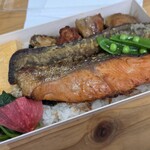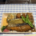 お弁当で一番重要なのはご飯だと思っているのですが、こちらは「つや姫」を羽釜で炊いていて、美味。具材もたっぷり半身の魚に加え、出汁巻きや白身魚の甘辛煮、さつま芋天、肉詰め椎茸天、鶏の山椒照りなど大変充実しています。大口注文も入るそうで、高級ゆえの需要がうかがえます。事前のネット予約がおすすめです。