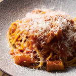 だが、味の秘訣は大量の玉ねぎにある。オリーブオイルでコンフィした玉ねぎをたっぷり使うことで生まれる自然な甘みが、ポイントの一つ。この甘みがパンチェッタの塩味と程よく拮抗、そこにトマトソースの酸味が加わることで、全体に奥行きのあるうまみと風味を楽しませてくれる。スパゲッティの量は、なんと1皿堂々の100gとボリュームも満点。2〜3人でシェアするも良し、1人でがっつりパスタとワインで済ませるも良し。TPOにあわせて楽しみたい。