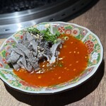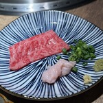 この日は最初の方から近江牛のサーロインが登場。塩で香りを感じ、次にタレでコクを重ねる。終盤にはホルモンが続く。脂の甘みが際立つシマチョウ(テッチャン)、うまみが深いハラミやサガリ。 一皿ごとに焼き方や食べ方を店主が丁寧にガイドしてくれるのも印象的だ。包丁の入れ方が緻密で、厚切りでもスッと歯が入る。 この「技」が、焼肉を“料理”として成立させている。