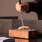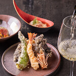 ディナーコースは17,000円と25,000円、33,000円の3種類を用意。一皿ごとに緊張感と美しさが共存する職人の舞台では、食材の個性を最大限に引き出す技が光ります。天つゆはもちろん、国産から海外産まで多彩に揃えた塩とのマリアージュも格別。食材や油の香り、音、光、そのすべてで天ぷらの本質を五感で体験することができます。また、天ぷらに合うよう選び抜いたワインを20種類ほど用意。シャンパーニュやフランス産ワインなどを中心とした、どれも上質な銘柄で、天ぷらとワインの組み合わせも楽しめます。