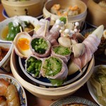 今回は数あるメニューの中から、門上さんのおすすめをご紹介。 まずは名物の焼売。蒸キゲン肉焼売、ブラック焼売、レタス焼売、チーズin焼売、海老ぷり焼売、明太大葉焼売、ホットチリ焼売と7種類も揃う。どの焼売も食べ応え充分だが、焼売の皮の代わりにヘルシーにレタスを使ってとびっこをトッピングしたレタス焼売、具材の中にもチーズを入れてさらに上にもチーズをのせたチーズin焼売、皮にイカ墨を使い具材にもイカのすり身を練りこんだブラック焼売など、一工夫ある焼売が魅力だ。