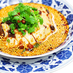 豆腐・挽き肉・ナス・シメジ・アサリなど具沢山の麻婆豆腐に、たっぷりのチーズをのせてバーナーで炙った 「焼きチーズ麻婆豆腐」。チーズのまろやかなコクが、山椒のピリ辛と絶妙に溶け合い、麻婆の辛みを優しく包み込むハイブリッド感がたまらない。