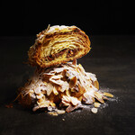 注目は造形美が目を引く「クロワッサン ショコラ」1,500円と「クロワッサン ジャポネ」1,500円。ガナッシュクリームやチョコレートクランチなどがトッピングされた「クロワッサンショコラ」は、中にたっぷりの生クリームとオレンジコンフィが入っていて、苦みと甘さ、酸味のバランスにスイーツとしての完成度の高さを感じさせます。