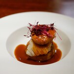 飴色玉ねぎのデザートや料理は数あれど…今まで出会ったことない唯一無二な一皿。新玉葱のタタンと言ったほうがいいのか…凝縮された新玉葱の甘み(この時点でもう想像してるのと違うよ)蘭王のコクと黒トリュフの香りの重なり。そこに木頭柚子の凛とした酸味が加わり初めて味わう完璧な調和。