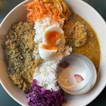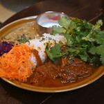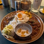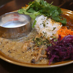 カレーは3種ある中から「和出汁と味噌チキンカレー」「ブルーベリーキーマカレー」をあいがけ(1,350円)で注文。
