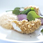 薄くスライスした蕪と柿のシャキシャキとした食感を楽しんでいると、中から現れたのはクリーミーでねっとりとしたテクスチャーの蕪のムース。野菜ならではの軽やかさとビネガーの酸味が絶妙です。