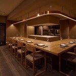 麻布十番のシックな雰囲気とはうってかわり、木材をふんだんに使い温かみにあふれた内装にチェンジ。広々としたオープンキッチンから運ばれるおいしい音と香りを楽しみながら奥行き90cmもある大きなカウンターでゆったりと料理を待ちます。「たまたま同じ日時に予約したという偶然の出会いが、僕や僕の料理を介して一つになってくれたらいいなと思ってオープンキッチンにしました」と原島さん。