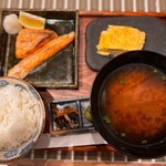 脂の乗った鮭ハラスにイクラを添えた親子焼きです,別皿 玉子焼きを頂くとジュワッと出汁が染み出します,