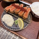 「サーモンレアカツいくら定食」2,600円(平日は2,500円)は、見た目にも華やかな贅沢定食。鮮度の良いサーモンをレアに仕上げ、衣はサクッと軽やか、中はとろけるような食感に。揚げ時間やパン粉の選定にも細やかな工夫が施されています。まろやかなタルタルソースと、いくらのほどよい塩味がサーモンのうまみを引き立てる、満足度の高い一皿です。