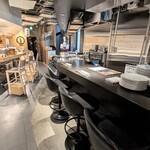 大使館や領事館が点在し、海外からの来訪者も多い広尾エリア。その土地柄も意識し、日本的な煮干しのうまみ、和牛の炭火焼き、そして奥行きのある熟成酒を組み合わせた新しい食の楽しみ方を提案したいという思いも、この店を立ち上げた理由のひとつとのこと。店内は黒を基調とした、バーのように落ち着いた雰囲気。無駄を削ぎ落としたモダンな空間に、カウンター8席とテーブル4席を配し、静かに食と酒に向き合える大人の時間が流れます。