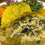 単品でも十分に楽しめます。日替わりの「バターチキンキーマ山椒の香り 温玉のせ」1,210円は重すぎないバランスのバターチキンテイストのキーマに温玉で満足度アップ。しかし、やはり副菜で野菜を多くのせた方がよりヘルシーであり満足度が上がるのは間違いないでしょう。