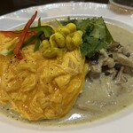 メインの「グリーンカレー」1,000円には「バター香るオムレツ」200円をトッピング。選べる副菜1種がつくのですが、きのこのデュクセル、スパイスオイル揚げごぼう、どちらも気になったので1種追加(追加料金100円)でオーダー。
