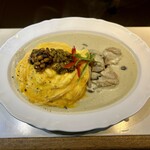 タイのグリーンカレーをベースとしているのですが、よりクリーミーでスパイシー。フレンチの要素も感じる唯一無二の絶品グリーンカレー。きのこのデュクセルもフレンチのデュクセルのカレー仕立てという趣で実に楽しく、相変わらず何を食べてもおいしいです。