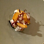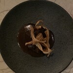 カウンターの向こうからキャラメリゼする甘い香りが漂ってきました。その正体はなんと「焼きみかん」。60℃程度の場所で寝かし、甘みを出してからキャラメリゼしたみかんの上に絞り出したのは、チョコレートクリームかと思いきやフォアグラと白レバーのムースです。