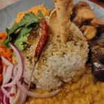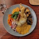 程よい辛さの鶏もも肉カレーにソーセージのテルダーラ(油炒め)が楽しいです。テルダーラと言えば野菜が多いのですが、ソーセージというのが良い意味で家庭的。基本はオーセンティックなのですが、そこに自由さが加わったワンプレートと言えるでしょう。