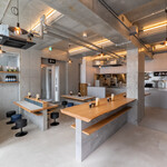 店舗外観は、大きな「うどん」の暖簾が目印。明るく開放的な店内には、一枚板を使用した存在感のある立ち食いカウンターを中心に、全32席を用意しています。気軽に立ち寄れる立ち食いスタイルでありながら、ゆったりと食事を楽しめる空間も備え、大人から子どもまで幅広く利用しやすい雰囲気です。