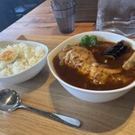 店内のカレーは、スープのベースを赤と黒の2種類からセレクト。赤は、野菜と鶏がらベースの澄んだうまみにトマトの酸味がアクセント、黒は野菜と豚骨ベースのコクのあるうまみが特徴です。