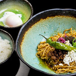 店主は広島出身の木元厚仁さん。元々東京で役者を目指していたが、震災があり帰郷。その後、ご当地グルメとして流行していた汁なし担々麺の店で働くことに。5年ほど勤めた後、奥様の出身地である京都で2020年独立を果たした。「汁なし担々麺が好きで、全国に広めたいと思い、その最初のステップとしてお店を開きました」。 看板メニューは汁なし担々麺と麻婆豆腐。複数のスパイスをふんだんに使って手作りした香り高いラー油が味わいの土台となっている。また、タレには丸太町の「澤井醤油」の醤油を、ネギは九条ネギを使用するなど地産地消にもこだわっている。