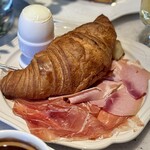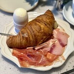 『選んでみたのは店名を冠した「LINDINOモーニングプレート」。半熟卵、イタリアのハム、特製ハーブポテト、そしてクロワッサンがセットになった華やかなワンプレート。