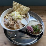せっかくなのでスパイスラーメンもインドカレーも味わえる「ミニカレーセット」1,500円を「豚まし」250円で注文。麺を選べるのですが、おすすめの極太麺にしました。