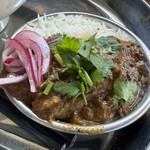 まずスパイスラーメン。自家製の極太麺は噛みごたえある食感で、噛んでいくほどにほのかに小麦の香りも立ち上がってきます。スパイスは仕込むごとにホールスパイスをローストしてミルでひいたものを使うという手の込みよう。ポピーシードやフェンネルも香り、チェティナードを感じるスパイスの香りは小麦の風味を消すのではないかと思われがちですが、それに負けない極太麺だからこそ香りの共存ができています。