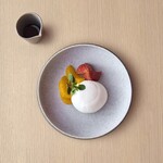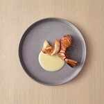 昆布出汁を鮪節、レモングラス、生姜、レモン皮、タイム、イタリアンパセリ、エストラゴンを通して6時間ほどかけて抽出します。ほっこりすると同時にその複雑妙味に食欲が覚醒! 添えられた「白味噌とあおさのりのグジェール」のふわしっとり、それでいてぎゅっと詰まった生地のおいしさに圧倒されます。うまみと香りが重なるはじまりの一品にいやが上にも期待が高まります。