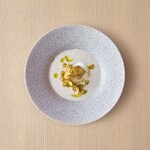 「ひらまつ」史上初のカウンターを設えた空間なら、供されるメニューも史上初。こちらではフランス料理、イタリア料理、日本料理、イノベーティブ料理のエッセンスを取り入れ、各ジャンルの「ひらまつ」のトップシェフたちがプロジェクトメンバーとなり全員で考案しています。フランス料理を軸に各ジャンルをミックスして再構築した、「ひらまつ」の新ブランドにふさわしい皿が並びます。