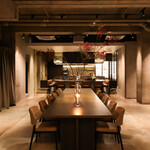 座席はバーカウンター8席とダイニングテーブル20席のほか、 10名まで入れる個室が1部屋。無機質な建築やモダンなインテリアが、ほのかな温度を感じさせる心地よい空間です。