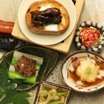 店内手前にあるカウンターゾーンの「食堂 松おか」は本格派の食堂。旬の厳選食材と職人の手仕事による料理を、圧倒的なコストパフォーマンスで堪能できます。こちらで提供されるのは、旬の食材をふんだんに使用した約10皿の「オマカセコース」6,600円。アラカルトでの注文も可能です。