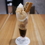 「クルミッ子 パフェ」は、コーヒージュレ、チョコレートムース、ローストしたクルミ、サブレのパウダー、塩キャラメル、ミルクアイスなどでクルミッ子を再構築したパフェ。トップにはそのままのクルミッ子が。ファンなら一度は食べておきたい、とっておきの一品です。
