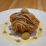 粗く刻んだクルミッ子とヨーグルトアイスをパイにのせ、その上からフランス産マロンペーストとクルミッ子のキャラメルで作ったクリームをたっぷり絞ったモンブラン。自家製カシスジャムの酸味がアクセントに。
