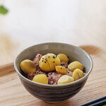 甘露煮にした栗を一粒丸ごとパイで包んで焼き上げた焼き菓子です。『こし餡』、白餡をベースにした『黄身餡』、『抹茶餡』の三種類があります。お好みでどうぞ。