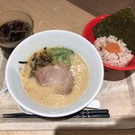 ラーメンは、白丸ハーフ(単品650円)、赤丸ハーフ(単品700円)、担々麺ハーフ(単品800円)など。サイドメニューは、炙りチャーシューSALAD(単品390円)、博多ひとくち餃子(単品4個320円)、とろ~りチーズ餃子(単品4個390円)、なめらか杏仁NOODLE(単品360円)など。セットメニュー時には、ラーメンは各500円、サイドメニューは各300円でお得に楽しめる。