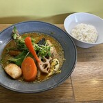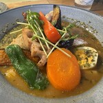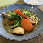 看板メニューは、「チキンと野菜のスープカレー」1,180円。様々なスパイスやハーブ、野菜を使って煮込まれたスープは優しくも奥深く、後を引く美味しさ。甘味、塩味、辛味、旨味、そしてハーブによってほんの少し感じる苦味まで含めて全ての味覚が刺激され、完璧なバランスの絶品です。