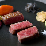 一口目はそのまま熟成肉の旨味と香りをダイレクトに味わい、二口目はステーキソースとバーベキューソースを合わせた甘めのソースで。三口目は生クリームとコーヒーを混ぜたコーヒークリームをつけて……クリームのほんのりとした甘味と、香ばしさが口いっぱいに広がる。