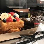 フード類では、店名を冠した「ローステッドバーガー」が特にオススメ。ジューシーで本格的な味わいが男女を問わず人気の一品だ。カリッと焼き上げられたバンズで、肉厚のハンバーグ&ベーコン&チーズを挟む。男性でも十分に満足できるボリュームだ。ほかにも、ローステッドドッグやチーズドッグ、ホットサンドなど、気軽にお腹を満たすことができるフードメニューが充実しているのもうれしい。また、コーヒーやホットサンドなどの一部のメニューは、テイクアウト&デリバリーにも対応しているので、ランチミーティングなどに活用できる。