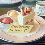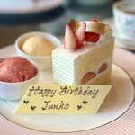 和三盆糖を使用した生地に、北海道産の小豆とバターを合わせた餡を詰め込んだ「ザ・米粉シフォン 北海道小豆」。トップにのった国産あまおうのいちご寒天が、彩りを添えている。
