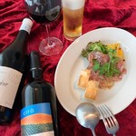「KANDO」では、ヨーロッパ産のビオワインをメインに扱い、2,000本のコレクションの中から季節に応じて選りすぐりの200本を用意。ゲストの好みや料理に合わせて、一番ふさわしい銘柄をセレクトしてくれる。「多くの方に美味しいビオワインを味わっていただきたい」という店長の思いから、グラス810円〜、ボトル3,780円〜(共に税込)と定価に近い、ビオワインとしては比較的リーズナブルな価格で提供している。