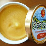 「うるまジェラート」450円。沖縄県産牛乳・きび砂糖を中心に地元の農産物や特産物を練り込んだ低カロリー低脂肪のヘルシーな無添加ジェラート。