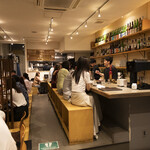 カウンター、テーブル、小上がりがあるシンプルでスタイリッシュな店内