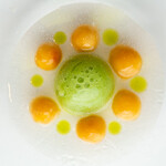 猫:「マンゴー」のフリュレは、外側の薄いチョコレートの殻を割ると、中からマンゴーとヨーグルトのジェラートクリーム、さらに宇和島産のブラッドオレンジとミントのソース、マンゴー色の2種のソースがとろ~りとあふれ出てくる至極の逸品ですよ!