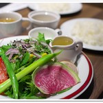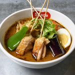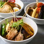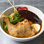 お店の自慢は、鶏ガラとトマトをベースに何種類ものスパイスを加えて作る独自製法のスープで、あっさりとして誰にでも食べやすいと評判。ほとんどの食材を素揚げしているのもこちらのオリジナル。渋谷店では、創業当時から変わらぬ味の「定番Suageスープ」と、Suage本店でのみ提供していた「イカスミスープ」の2種類のスープが味わえます。