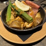 ランチメニューより「サブジ(チキン)」。インドの野菜の炒め煮「サブジ」をアレンジ。自家製スパイスをすり込んだチキンをスープ仕立てにしています。サラダ、フラットブレッドつきで、パンの盛り合わせのお代わりは無料。セットドリンクは+250円。
