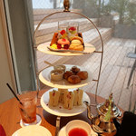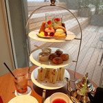 上段には紫陽花に見立てた特製バタークリームのマカロンや四季折々のスイーツ各種を、中段にはスコーン、下段には自家製ブレッドをセットした英国スタイルのアフタヌーンティーセット。紅茶はお好みの茶葉で2回までおかわりできます。